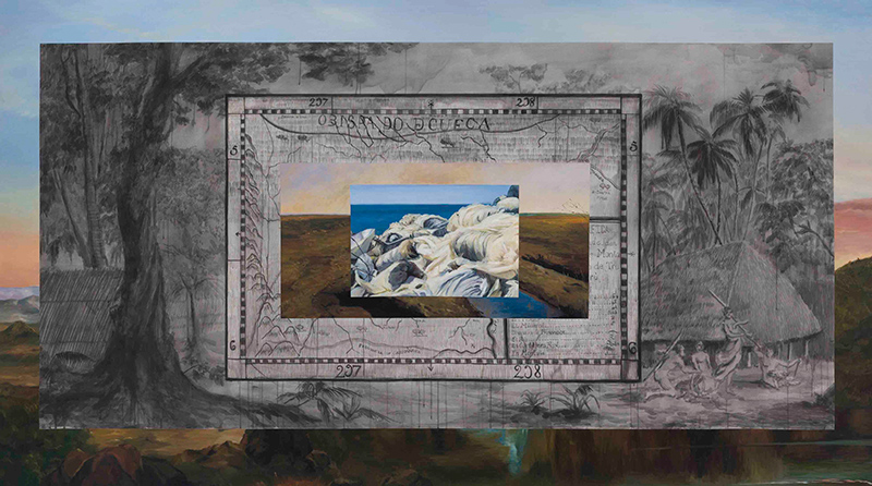 Alle parole del filosofo e attivista indigeno Ailton Krenak e ai testi della femminista decoloniale Françoise Vergès o di Nancy Leys Stepan, tra gli altri, si contrappongono immagini dipinte al loro interno, alterate o ripetute. Queste cadono come se fossero state simboli di verità e si posano irrimediabilmente sull'impronta erosiva dell'uomo dall'epoca coloniale a oggi - che ha maltrattato in un modo o nell'altro la terra e le sue «risorse» impropriamente chiamate - nel tentativo di fagocitare voracemente la realtà di diverse comunità e habitat. Dalle miniere coloniali di Potosí, alle discariche a cielo aperto in paesaggi naturali come il deserto di Atacama o allo sfruttamento dei frutteti di Almería in Spagna, la pittura di paesaggio per- de la sua aura di neutralità e si rivela come un violento generatore di distanza e differenza..