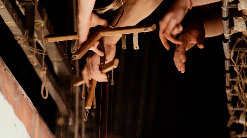 RG - Diteggiatura è l'arte di mettere le dita su di un strumento musicale però l'ho voluto utilizzare come l'arte di mettere le dita su delle corde che sono i fili che vengono utilizzati per muovere la marionetta. C'è una cosa che per tanti animatori dei gesti quindi marionettisti che muovono marionette è importante, lasciarsi sempre andare all'oggetto in una relazione univoca perché se si anima un oggetto e si ha il potere, il controllo totale su questo, sempre si lascia uno spazio per cui un oggetto possa rispondere in qualche modo. E quindi le mani e le dita sono in qualche modo un elemento molto importante.