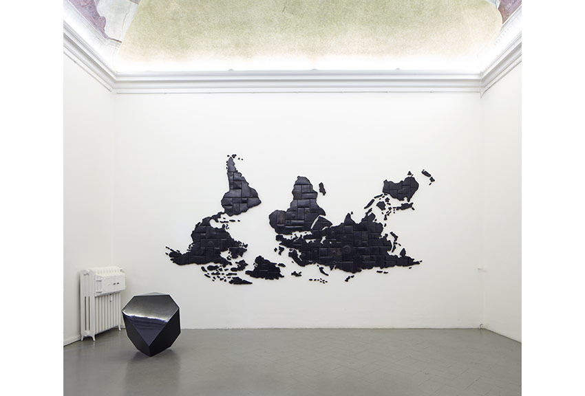 In particolare, nella prima sala, Aeneas Wilder mette in discussione la durevolezza e la sicurezza statica della materia attraverso “Untitled #191”, un lavoro strutturato solo tramite l’equilibrio e la forza di gravità e in cui non c’è traccia di nessun sistema di fissaggio tra i numerosi elementi dell’installazione. Nella seconda sala, “Lontanodentro #2” di Davide Dormino si materializza in una cascata costruita con fili di ferro che coprono l’intera stanza e convergono dal perimetro del soffitto al centro del pavimento e in cui il visitatore può decidere se osservarlo da una prospettiva periferica o attraversarlo per raggiungere il suo nucleo. Nella terza sala, “All Is Shining the Same” di Marzia Corinne Rossi si compone di un intrico di elementi autoportanti in carta vetrata industriale pigmentata, materiale che connota la produzione dell’artista, che si allineano nello spazio espositivo mutando le sue caratteristiche fisiche e percettive. Di fronte, Diamante Faraldo presenta “A Nord del Futuro”, una grande mappa rovesciata che impone la necessità di fermarsi a scrutarla attentamente per distinguere sfumature, dettagli e particolari nascosti dietro un materiale che prova a celarsi nella sua ambiguità. Infine, nell’ultima sala, Andrea Nacciarriti con il lavoro “Crystallize #002 [matter]” indaga sulla capacità di trasformazione e sulla fragilità della materia, dilatando la sospensione e analizzando la categoria di transizione, attraverso un atto di frammentazione che la trascina aldilà delle nostre possibilità di raggiungerla.