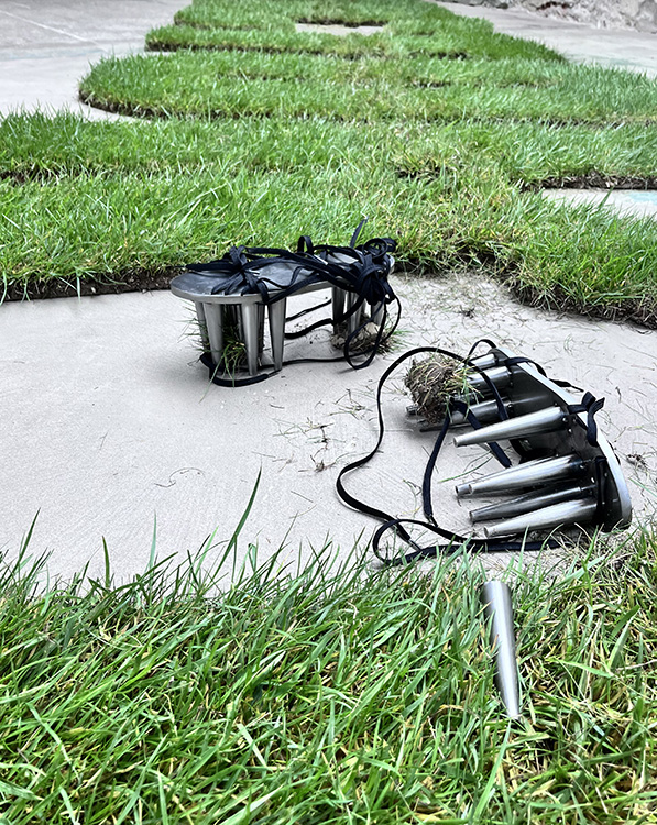 Loredana Longo, How to make my victory, 2024, 920x 200 cm, prato, scarpe di ferro, veduta d'insieme della mostra, Villa Rospigliosi, Prato