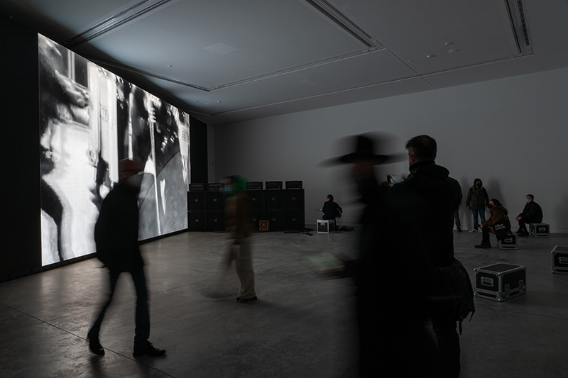 MF - Ci sono due elementi materici che compongono l’installazione. La parete a LED dal pavimento al soffitto e la parete di amplificazione che è formata da sei amplificatori full-stack da 100 watt. Mi esibisco dando le spalle al pubblico. Il suono che genero passa in un’unità di controllo personalizzata che converte e sincronizza il suono con le immagini. L’unità mi permette di controllare i vari stati dell’uscita, come il panning, la velocità e la randomizzazione. Con l’impostazione più lenta potrei rimanere su un’immagine per tutto il giorno, con la più veloce sparare 60 immagini al secondo. La dimensione della parete a LED è pensata per occupare e dominare lo spazio.